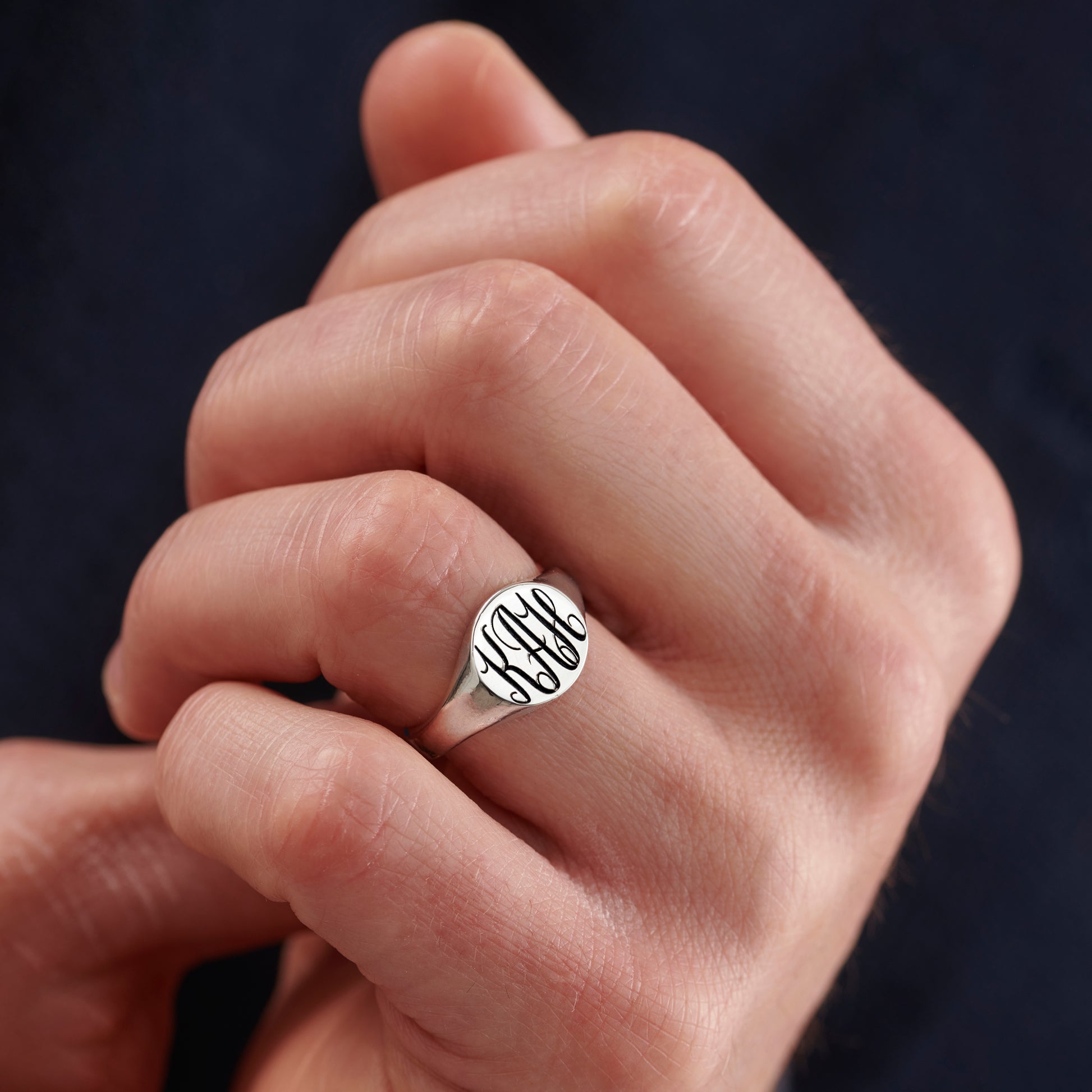 This gorgeous monogrammed signet ring is crafted from Sterling Silver. This circle design is the perfect way to make a statement. Our jewellers can monogram your ring with your chosen initials making this ri...