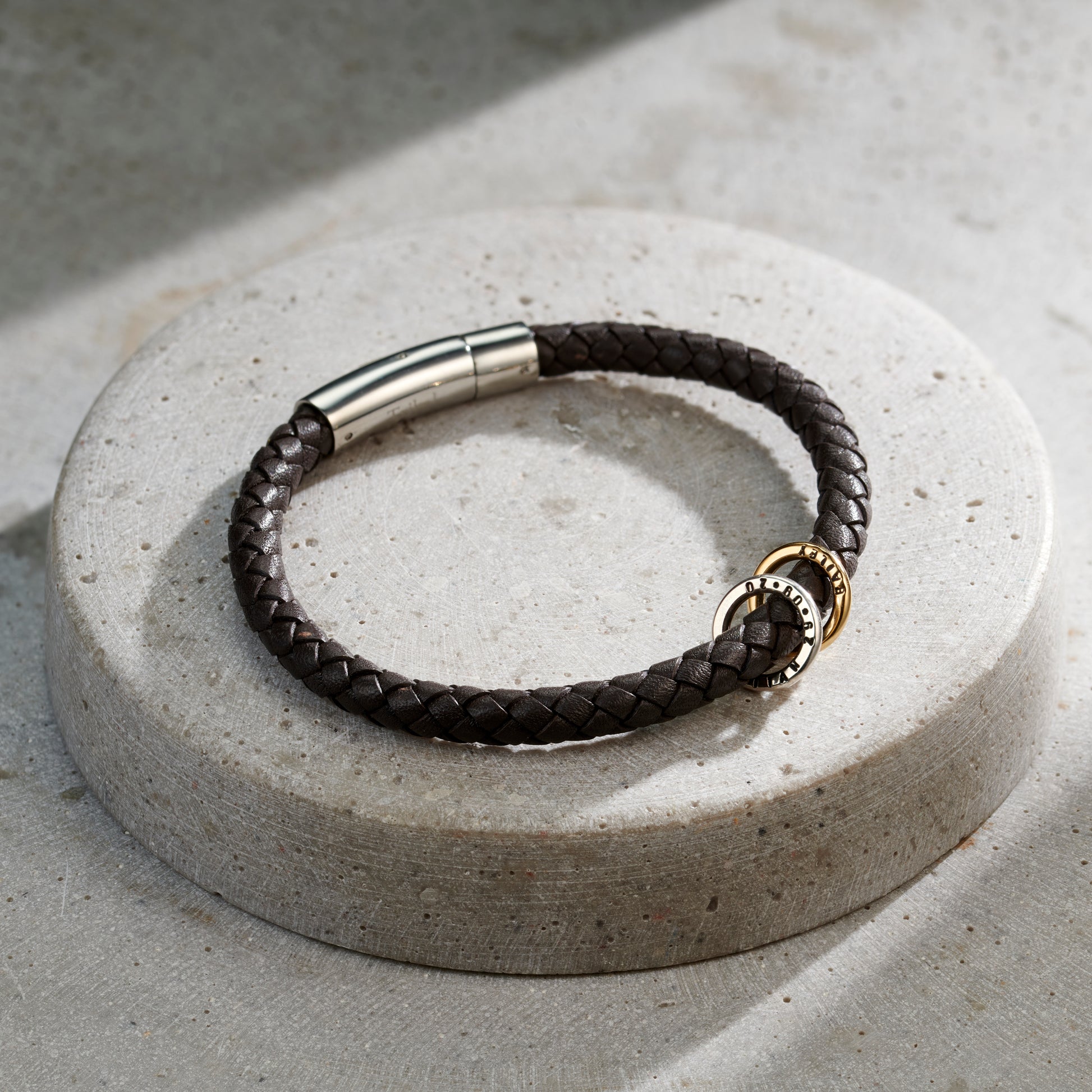 This gorgeous mens mixed metal bracelet is made from woven brown leather and finished with personalised circle charms. Add up to three circle charms each can be personalised with your chosen words, dates or ...