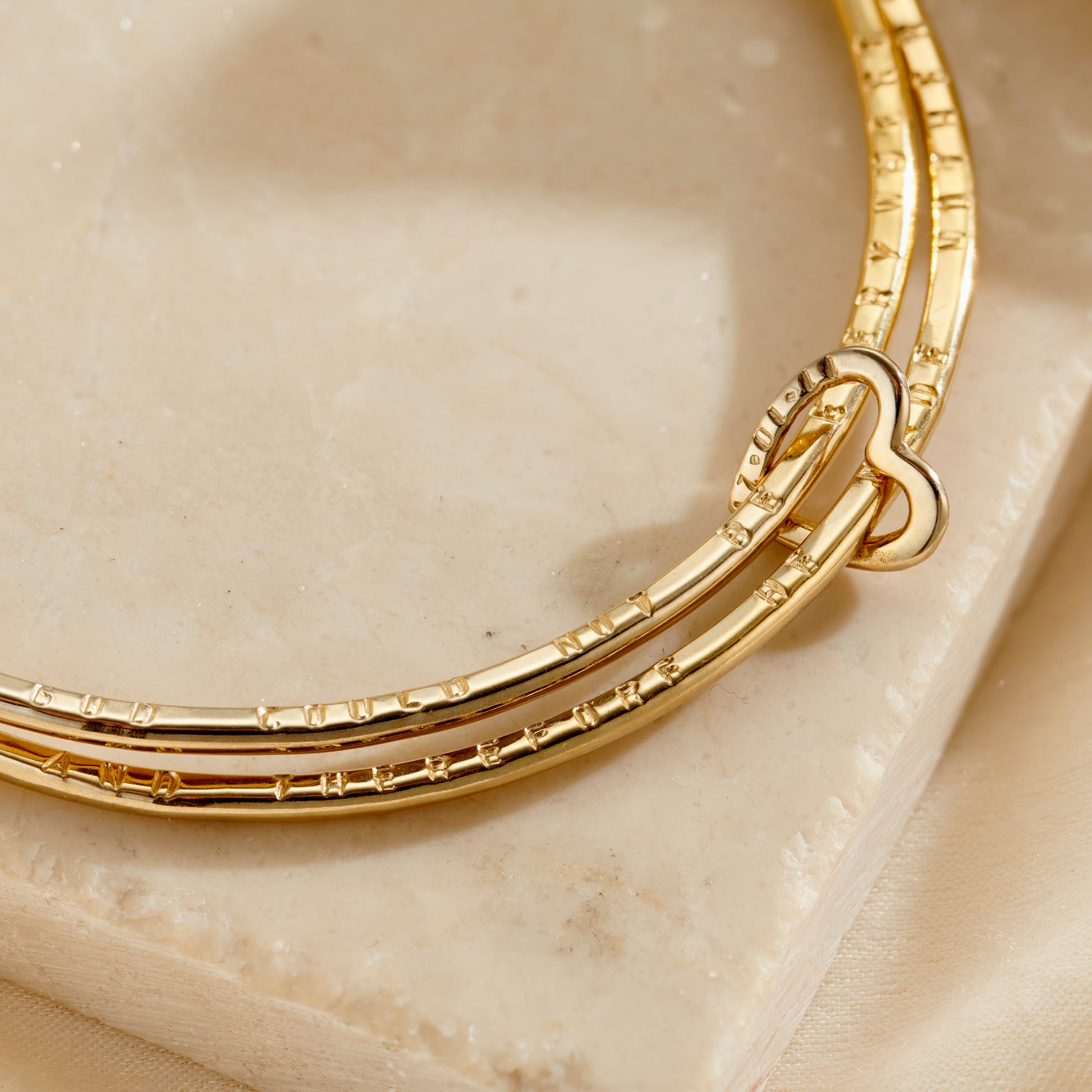 The beautiful Personalised Double Bangle With Heart comprises of two sterling silver bangles held together by a delicate sterling silver heart, and you can add more hearts if desired. For a truly special tou...