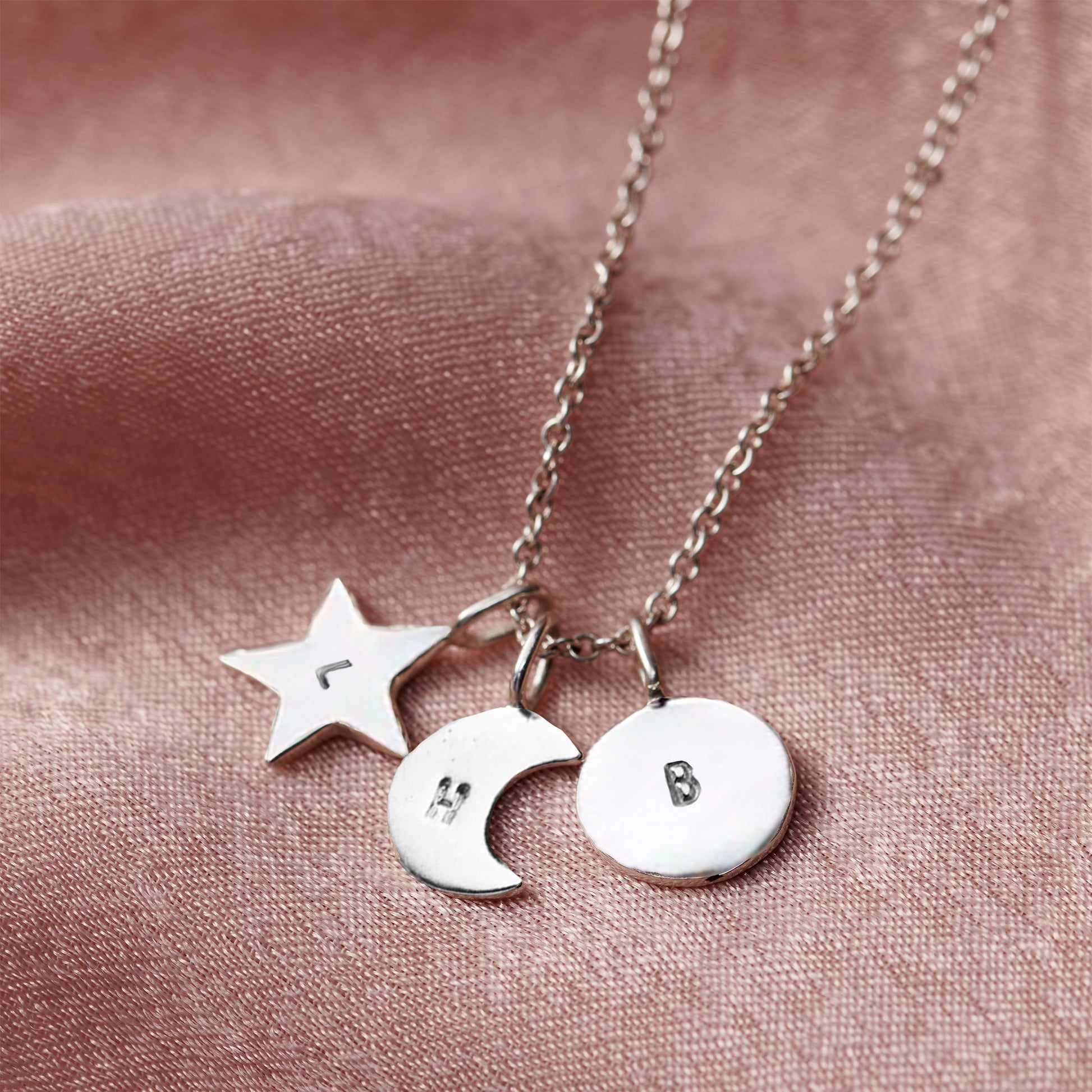 Symbolising strength, wisdom and eternity, the beautiful Personalised Sun Moon & Star Necklace is handcrafted from Sterling silver. Let the heavens guide your way with this celestial design, featuring a ...